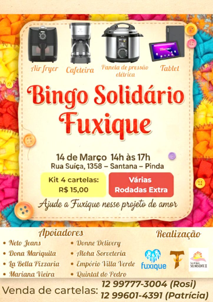 Cultura Bingo Solidário Fuxique acontece neste sábado em Pindamonhangaba Ler mais >> 13 de março de 2026