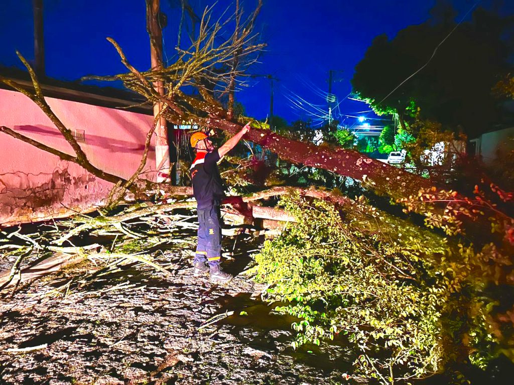 Entre os atendimentos realizados, houve registros de quedas de árvores sobre vias públicas, áreas próximas a equipamentos públicos e redes elétricas, além de pontos de alagamento, como no bairro Pinhão do Borba, onde residências foram atingidas e receberam atendimento da Defesa Civil.