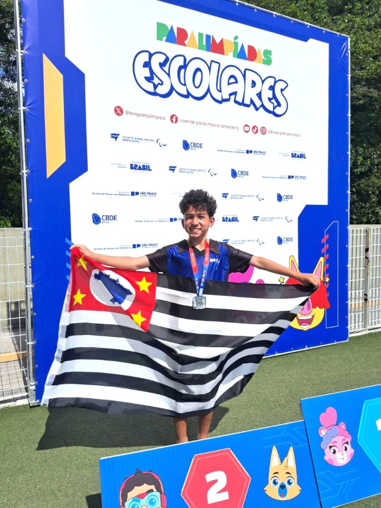 A competição, organizada pelo Comitê Paralímpico Brasileiro (CPB), reúne anualmente milhares de jovens atletas de todo o país, promovendo inclusão, formação esportiva e revelação de talentos paralímpicos. Na foto oficial enviada pela equipe técnica, Matheus aparece diante do painel das Paralimpíadas Escolares, celebrando sua medalha e carregando a bandeira paulista, símbolo do orgulho regional e da força do esporte estudantil.